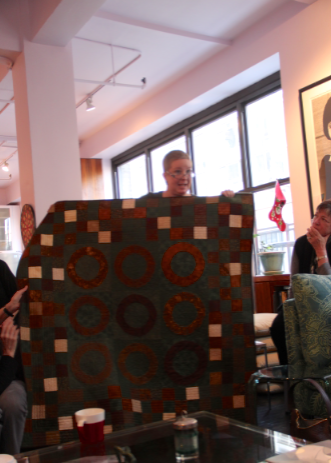 We had a little gathering at my place, with Pat and members of my NYC MOD quilters. Pat brought a few quilts, and we got to pick her brain, here her story, chat, munch cookies and down the coffee... Here she is sharing a few of her quilts and her process in these shots, with the super talented, Yolanda sitting next to her, checking them out...